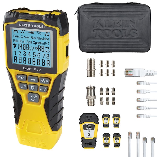 Tester, Self-storing Test + Mapâ„¢ Remote (#1), 5 - Test + Mapâ„¢ Remotes (#2 - #6), 7 - Coaxial Barrel Adapters (female-to-female), 7 - Coaxial Barrel Adapters (male-to-female), 7 - RJ45 Jumper, 2 - RJ11 Jumper, 2 - RJ12 Jumper, Carrying case, 9V alkaline battery