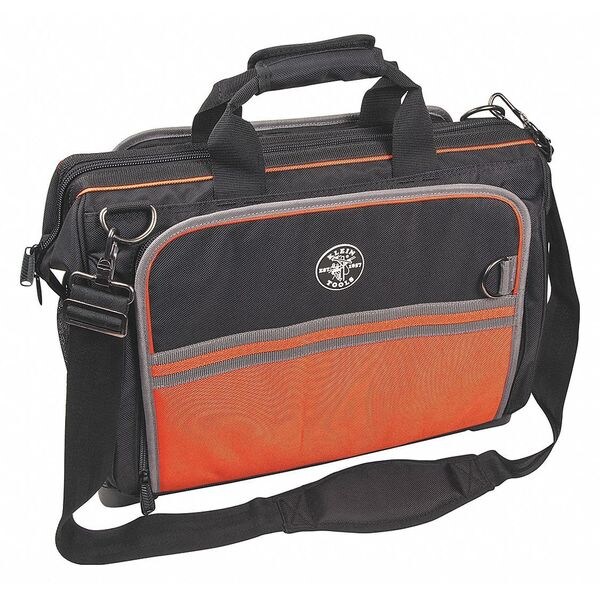 Wide-Mouth Tool Bag, Material 1680D Ballistic Polyester, Closure Type Zipper, Overall Height 16 in, Overall Depth 6 1/2 in, Overall Width 19 in, Color Black/Orange, Features Lock Bars to Keep Bag Open, Two Padded Meter Pockets, Orange Interior, Fully Molded Bottom, Shoulder Strap and Padded Handles, Number of Inside Pockets 2, Number of Outside Pockets 53, Number of Pockets 55