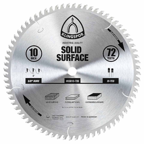 10" 72-Tooth Solid Surface Saw Blade, KSB10-728, Solid Surf 10", 4" Cutting Depth, 0.087, 10 in, 5/8 in, 0.126, 4 in, 0.126, 10 in, Table Saw Blade, 72, General Purpose Rip and Crosscuts in Solid Surface, Plexiglass, Vinyl, Laminate, 0.126, Table Saw, Sliding Table Saw, Solid Surface, Carbide, 5/8", 0 Degrees, M-TC, Solid Surfface, 7,600 RPM, Round, Combination, Plasitc, Laminate, Table Saw Blade, 7,600 RPM, Table Saw, Sliding Table Saw, 1 Per Box