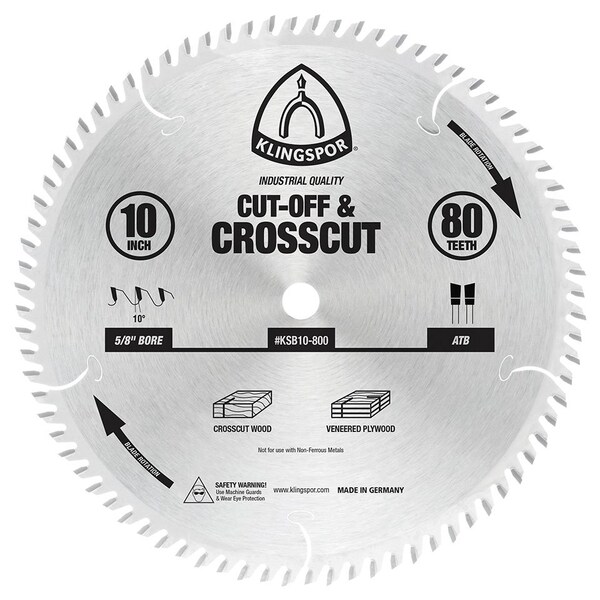 10" 80-Tooth Cut-Off & Crosscut Saw Blade, KSB10-800, Crosscut 10", 4" Cutting Depth, 0.087, 10 in, 5/8 in, 0.126, 4 in, 0.126, 10 in, Table Saw, Miter Saw Blade, 80, General Crosscuts in Plywood, 0.126, Table Saw, Miter Saw, Wood, Plywood, Carbide, 5/8", 10 Degrees, ATB, Crosscut, 7,600 RPM, Round, Crosscut, Wood, Table Saw, Miter Saw Blade, 7,600 RPM, Table Saw, Miter Saw, 1 Per Box