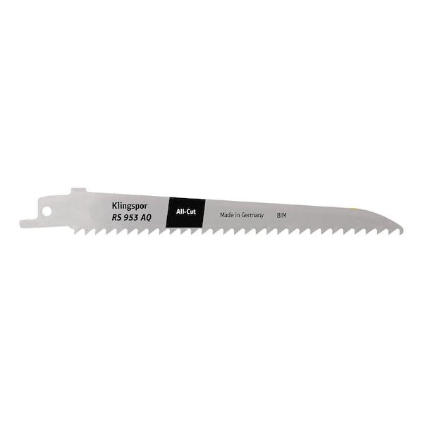 The KLINGSPOR - 670421 is a reciprocating saw blade for use with reciprocating saws. It features a bi-metal construction with a straight back style and milled set cutting edge style. This blade is intended for demolition work and cutting nail-embedded wood, and is used on nail-embedded wood, chipboard, plastics, and epoxy resin. It is configured with a 6 TPI tooth pattern for fast cuts and rough curve cuts.