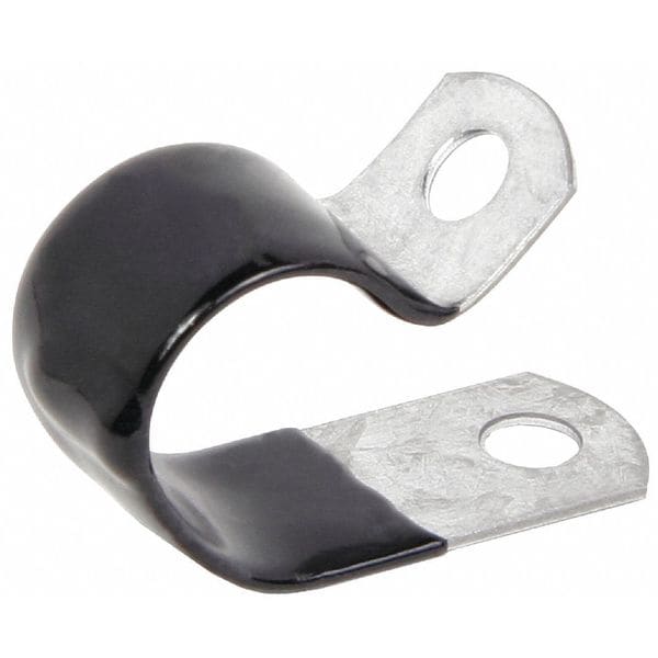 Cable Clamp, Cable Clamp, Cushioned, Steel, Cable Clamping Dia. 7/16 in, Mounting Hole Dia. 0.2188 in, Clamp Thickness 0.032 in, Clamp Band Width 1/2 in, Gray, Vinyl Cushion Type, Hot Dipped Galvanized Clamp Finish, Temp. Range (F) -30 to +180, Vinyl Plastisol Coating Material, Liner Color Black, Package Quantity 50