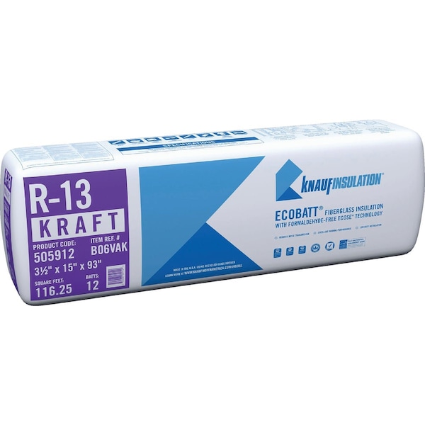 R-13 15''x93'' Kraft Faced Batt Fiberglass Insulation, 12 Count