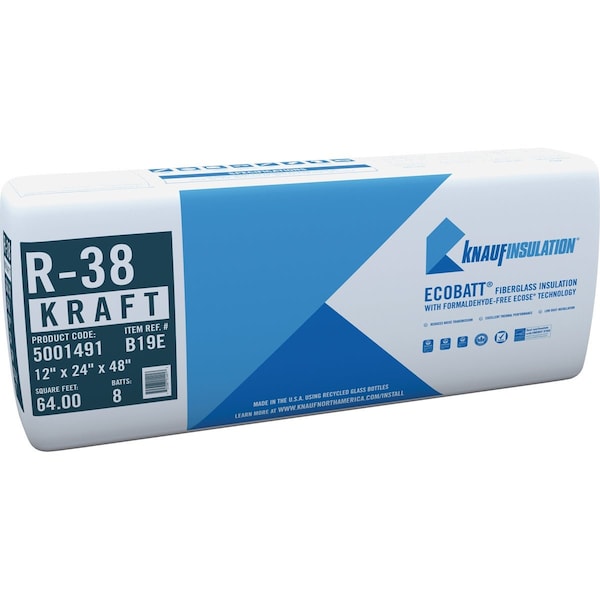 R-38 24''x48'' Kraft Faced Batt Fiberglass Insulation, 8 Count