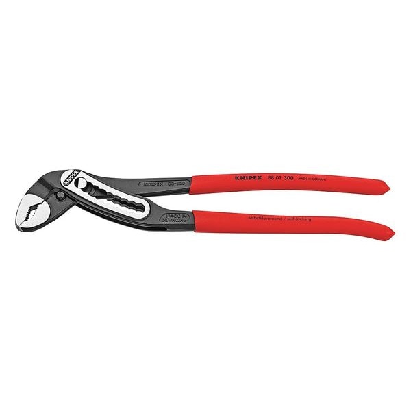 If you need to tighten or loosen a pipe joint, the KNIPEX 88 01 300 SBA Water Pump Pliers are just what you need. The tongue and groove pliers have been atramentized and polished for a smooth finish. These pliers also come with plastic coated handles that offer added comfort and grip. Made of chrome vanadium electric steel, these pliers can be used on both dry and wet joints. This water pump plier has an overall length of 12 in., jaw width of 1 1/4 in., adjustable groove joint, V-jaw, dipped handle type and 2 3/4" max jaw opening. When it comes to making quick work of your projects, the KNIPEX Water Pump Plier is the tool you will want to use.
