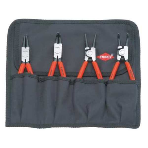 Retaining Ring Plier Set, For Ring Type External, Internal, Plier Types Retaining Ring Pliers, Overall Length 6 3/4 in, 7 1/4 in, Tip Diameter 0.078 in, Tip Angle 0 Degrees , 90 Degrees , Jaw Opening Type Spring Return, Number of Pliers 4, Features Adjustable Snap-Closure, Sturdy, Finish Atramentized, For Bore Diameter 3/4 to 2 23/64, For Shaft Diameter 3/4 in to 2 3/8 in, Grip Material Plastic, Handle Color Red