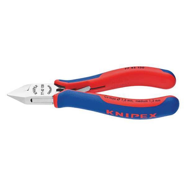 The KNIPEX 77 42 130 5-1/4" Electronics Diagonal Cutter is a professional tool you can rely on. It has a cutting capacity of medium-hard wire 3/64 in, soft wire 1/64 in to 1/16 in. Featuring a zero backlash box joint and pointed head, the diagonal cutter allows for smooth and precise cuts. The hardening of the cutting edge is approx. 57 HRC, making it suitable for tough materials like steel. Its multi-component grip ensures comfort while you work with this diagonal cutter. The overall length of this product is 5 1/4". The KNIPEX 5 1/4" Diagonal Cutting Plier is an essential tool that will make your job easier and faster.