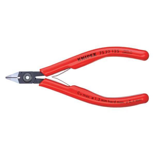 The KNIPEX 75 22 125 5" Electronics Diagonal Cutter is the perfect tool for snipping wires. It has a straight nose and plastic grips, making it safe to use. Made of high grade special tool steel, this diagonal cutting plier is designed to cut hard or soft wire. With its 29/64 in jaw width and 1/2 in jaw length, the diagonal cutter can cut most sizes of wire easily. Its overall length is 5 1/4 in., with a small beveled cut and plastic grips that ensure comfort and safety while working. The KNIPEX 75 22 125 5" Electronics Diagonal Cutter is an ideal addition to your tool kit.