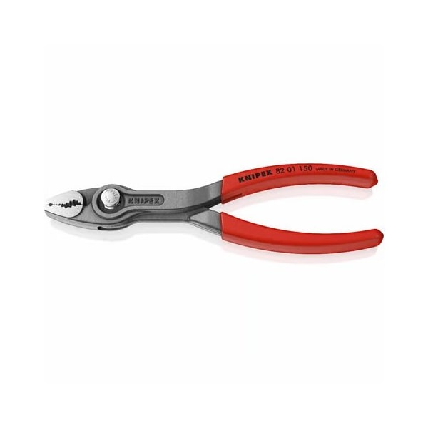 Knipex Tools 82 01 150 TwinGrip Slip Joint Pliers feature a unique combination of front and side gripping. Front jaw design grips stripped screws. Optimized side jaw with opposing teeth provides maximum force. Side gripping jaws are used for round square and hex materials. Reliable gripping of flat workpieces works due to the three-point system. Box joint design adds tool stability. Slim head design is great for working in confined spaces
