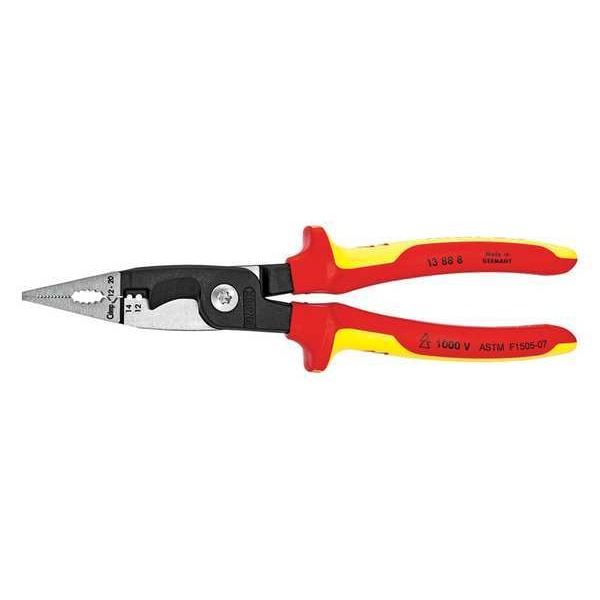 These KNIPEX 13 88 8 US 8" installation pliers are the perfect solution for cutting and stripping wire. The insulated crimper has a multi-component handle cover that ensures comfortable grip while working. It is VDE tested, which means it can be used in harsh environments with no risk of electric shock. Its capacity is 20 to 12 AWG, making it suitable for cutting and stripping both small and large wires. The tool also cuts and strips cables. When you need to cut or strip electrical wire or cable, you will want these KNIPEX Crimping Pliers on hand.