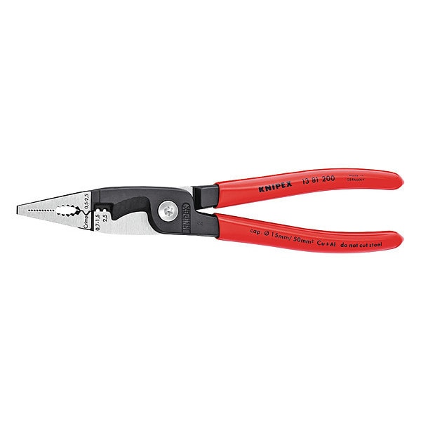 The KNIPEX 13 81 200 SB Electrical Installation Pliers is a versatile tool that can be used for cutting, gripping and stripping. This product has serrated jaws to help grip wires securely. The electrical installation pliers will make your next project easier with its multiple functions.