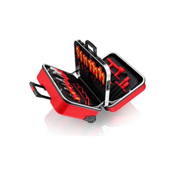 Knipex 98 99 15 42 pc universal tool set-1,000v insulated features: hard-wearing case made of abs material, red- containing a range of knipex tools for work on electrical installations, tested according to iec 60900, as well as additional protective covers, clamps and gloves all tools 100% tested and meet astm f1505 and iec 60900 requirements sturdy aluminium frame with d-shape rings for belt and fix, sturdy centre board with multi-purpose push-in facilities by elastic loops and 12 small pockets 66 pounds (30 kg) maximum load, stands securely in any opening position due to lid-holders and hinge mechanisms on both sides, that register in a position of 45 and 90 can be opened on one or both sides- bottom tray and cover can be opened independently