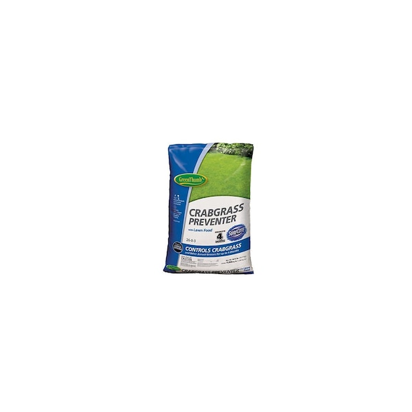 Green Thumb, 15,000 SQFT Coverage, 26-0-3 Crabgrass Preventer Plus Lawn Food, Apply Early, Before Crabgrass Germinates, Easy To Use, Controls Crabgrass & Other Annual Grasses, Contains 0.13% Dimension, 30% Controlled Release Nitrogen, Continuously Feeds For Up To 16 Weeks.