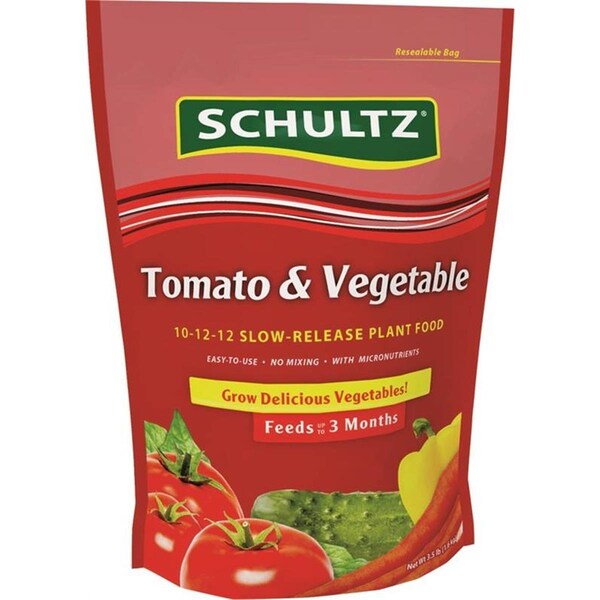 For growing delicious tomatoes and vegetables. Contains specific micronutrients important for plant health and brighter more rapidly growing plants. Enriched with Schultz extended feed plant food that feeds continuously for up to 3 months. Features -Slow-Release Vegetable Fertilizer -Contains specific micronutrients important for plant health and brighter more rapidly growing plants -Enriched with schultz extended feed plant food that feeds continuously for up-to 3 months -10-12-12 - Tomato & Vegetable -Slow-Release Specifications - Size: 3.5 - Weight: 3.66 lbs