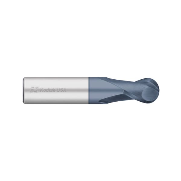 These Kodiak Cutting Tools® ball end two flute stub length carbide end milling cutters feature a 30 helix angle and are center cutting for plunging, slotting and profiling. As with all of our solid carbide tools, these end mills are manufactured using state-of-the-art machinery, manufacturing processes and inspection techniques, making them the preferred choice of carbide endmills for machinists wanting to produce high quality parts with maximum tool life. The addition of our ALTiN coating allows for increased speeds & feeds as well as longer tool life