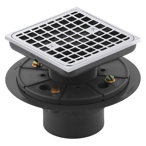 Shower Drain, Standards ASME A112.18.2, CSA B125.2, Connection Thread Type Not Applicable, Flange Diameter 5 3/8 in, Height Above Flange 2 7/16 in, Includes Strainer No, Includes Grate Yes, Nominal Pipe Size 3 in, Pipe Outside Diameter 2 3/8 in, Drain Material Brass, Plastic, Includes Not Applicable, Connection Type Threaded, Ligature Resistant Not Ligature-Resistant, Body Height 4 1/8 in, Product Type Shower Drain, Drain Style Square, Grate Material Brass, Grate Color Silver