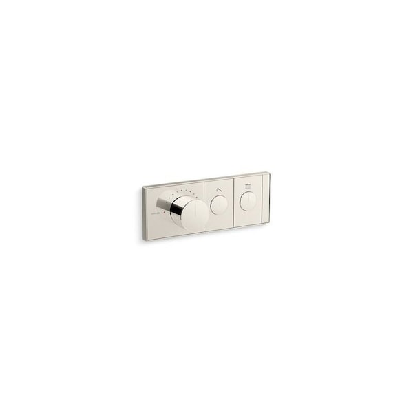 Thermostatic technology allows you to maintain consistent temperature and flow control for the ultimate shower experience. This sleek thermostatic valve control panel with recessed push buttons is designed for use with an Anthem two-port thermostatic valve K-26340. The trim plate includes a temperature control knob with integrated adjustable high-temperature limit stop as well as shower outlet activation buttons that pop out for the adjustment of water flow up to 8 gpm.
