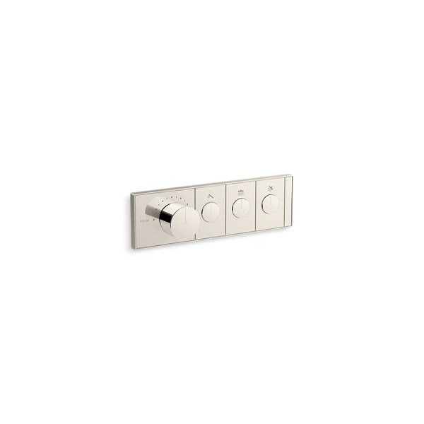 Thermostatic technology allows you to maintain consistent temperature and flow control for the ultimate shower experience. This sleek thermostatic valve control panel with recessed push buttons is designed for use with an Anthem three-port thermostatic valve K-26341. The trim plate includes a temperature control knob with integrated adjustable high-temperature limit stop as well as shower outlet activation buttons that pop out for the adjustment of water flow up to 8 gpm.