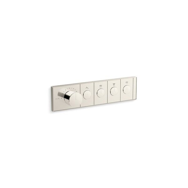 Thermostatic technology allows you to maintain consistent temperature and flow control for the ultimate shower experience. This sleek thermostatic valve control panel with recessed push buttons is designed for use with an Anthem four-port thermostatic valve K-26342. The trim plate includes a temperature control knob with integrated adjustable high-temperature limit stop as well as shower outlet activation buttons that pop out for the adjustment of water flow up to 8 gpm.