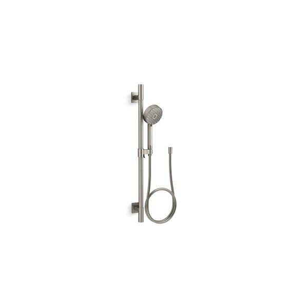 The Awaken G110 2.5 gpm multifunction handshower kit includes a handshower, 24" slidebar, and 60" smooth hose. Advanced spray performance delivers three distinct sprays-wide coverage, intense drenching, targeted massage-plus pause feature. The ergonomic design makes for superior comfort and ease of use, with ideal balance and weight in the hand. The artfully sculpted sprayface reveals simple, architectural forms that complement contemporary and minimalist baths.