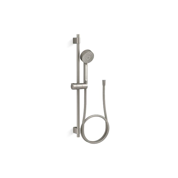 This all-in-one kit includes the Awaken G90 1.75-gpm multifunction handshower, a 24-inch slidebar, and a 60-inch ribbon hose. Advanced spray performance delivers three distinct sprays - wide coverage, intense drenching, or targeted - with a smooth rotation of a thumb tab. Ergonomic design makes for superior comfort and ease of use, with ideal balance and weight in the hand. The artfully sculpted sprayface reveals simple, architectural forms that complement contemporary and minimalist baths.