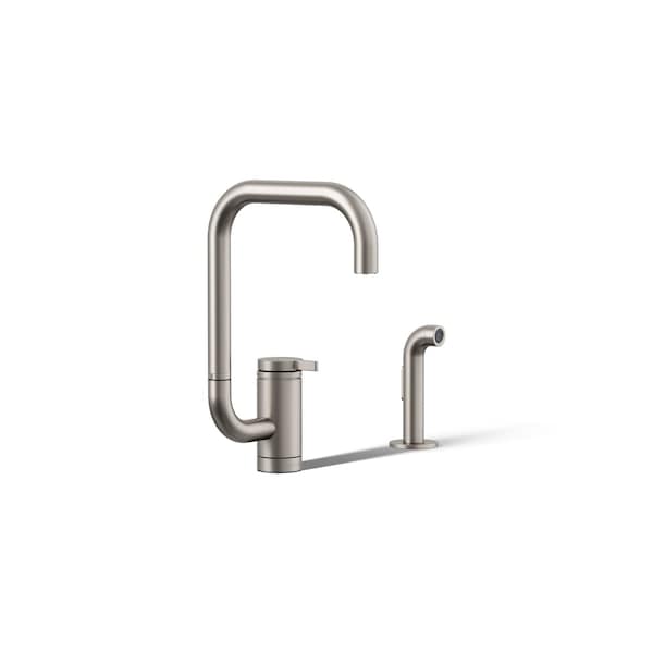 Sleek and minimalist, the KOHLER Components collection exudes calm sophistication. Strong, confident lines create bold and distinctive silhouettes accentuated by refined design details. The Components single-handle deck-mount kitchen sink faucet melds this very style with a unique two-function aerator to supply two spray functions with a simple twist of the end of the spout, and it also includes a convenient coordinating side sprayer.