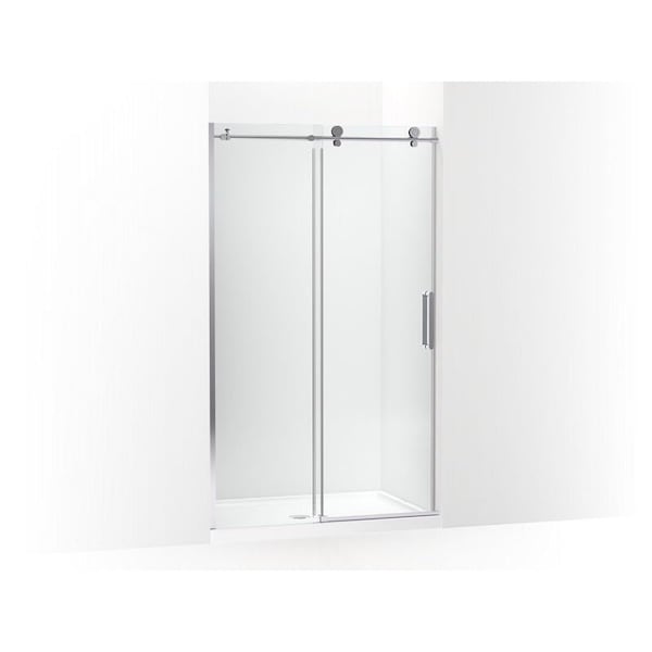 Add the final touch to your showering space with the luxurious, frameless Composed sliding shower door. This contemporary design includes exposed rollers engineered to glide across a heavy-duty top rail, offering a bold style statement and smooth operation. The door offers ample head clearance and features beautiful back-to-back handles for easy entry and exit. This shower door includes heavy 3/8in thick tempered glass and Controlled Close technology on the sliding panel to securely close the door for exceptional water containment. Simple installation includes out-of-plumb adjustability of 3/8in on both the fixed and sliding glass panels.