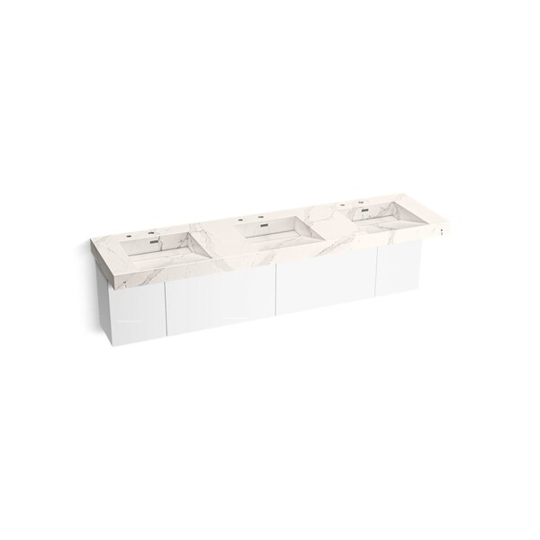 Maximizing both refined materials and careful craftsmanship in every inch of its design, the Constellation wall-mount basin lavatory system and white powder-coated stainless steel shroud is a sophisticated, all-in-one washroom solution that fits flawlessly into any commercial environment. Beautifully sculpted from your choice of Corian Solid Surface or Silestone quartz material, models are available in 30in, 60in, and 90in lengths and have been engineered to optimize performance with select Composed, Kumin, and Oblo deck-mount touchless faucet, soap dispenser, and accessory bundles, ordered separately. They also include matching stone material drain covers for an elevated aesthetic.