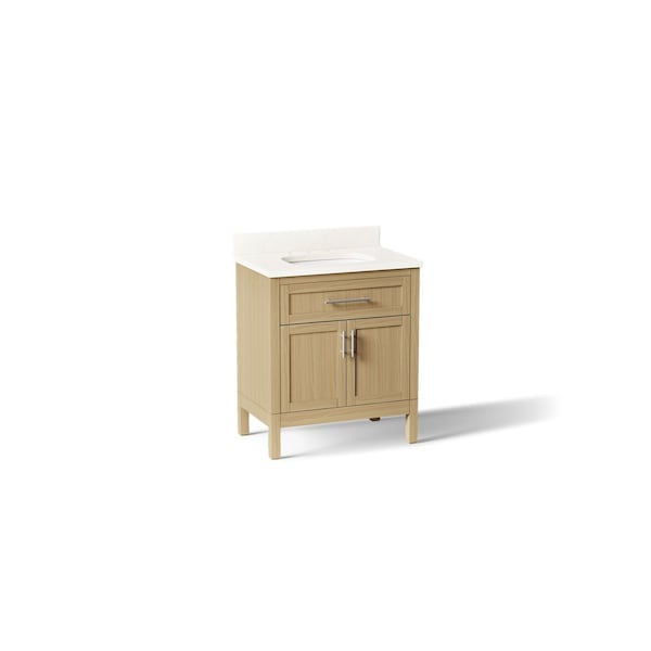 In typical Shaker style, the Hadron bathroom vanity set is a classic. Its modest, clean design doesn’t overpower your bathroom - it blends into it - lending itself to many decorating styles. The Hadron vanity set includes cabinet, quartz countertop, sink, and Vibrant Brushed Nickel hardware. Pair with any KOHLER widespread bathroom sink faucet for your own unique touch.