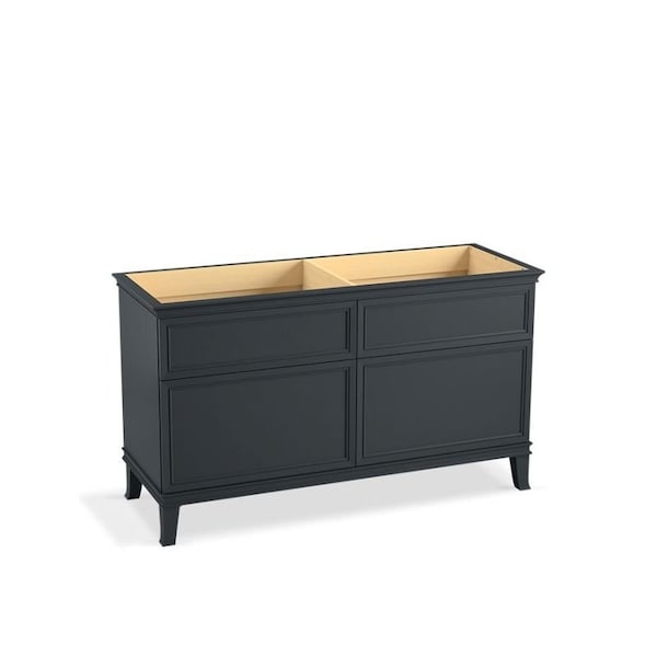 Elegant minimalist design meets midcentury traditional influence and Kohler craftsmanship in the Harken bathroom vanity. This simply ornamented, all-drawer cabinet features cornice molding, reminiscent of an American Federal-style bookcase, while flared solid-wood legs inspired by early nineteeth-century linen presses elevate the vanitys style and off-floor functionality. Customize your bathroom centerpiece with a coordinating quartz top, contrasting industrial-style drawer pulls, and organizational in-drawer accessories sold separatelyfor a look that fits your aesthetic and space.