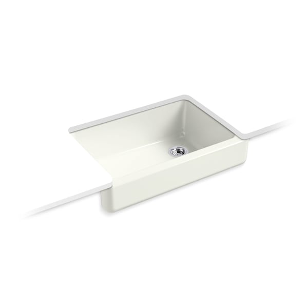 The Whitehaven apron-front kitchen sink features a streamlined and versatile farmhouse style to complement any decor. Perfect for remodeling projects, it has a shortened apron that allows for installation on most new or existing 33-inch standard cabinetry. The Self-Trimming design requires only a simple rough cut, overlapping the cabinet face for beautiful results and easy installation. A large single basin accommodates large pots and pans, while the sloped bottom helps with draining and cleanup. Crafted from enameled cast iron, this sink resists chipping, cracking, or burning for years of beauty and reliable performance.