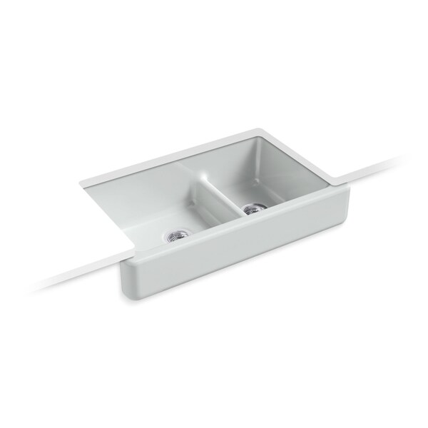 The Whitehaven apron-front kitchen sink features a streamlined and versatile farmhouse style to complement any decor. Perfect for remodeling projects, it has a shortened apron that allows for installation on most new or existing 36-inch standard cabinetry. The Self-Trimming design requires only a simple rough cut, overlapping the cabinet face for beautiful results and easy installation. A low barrier divides the two compartments, making it easy to wash and rinse large items while still keeping the two basins separate. Crafted from enameled cast iron, this sink resists chipping, cracking, or burning for years of beauty and reliable performance.