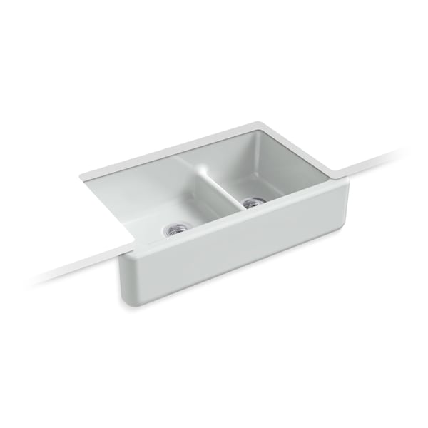 The Whitehaven apron-front kitchen sink features a streamlined and versatile farmhouse style to complement any decor. The Self-Trimming design requires only a simple rough cut, overlapping the cabinet face for beautiful results. The sink is designed to fit in most standard 36-inch apron-front cabinetry. A low barrier divides the two compartments, making it easy to wash and rinse large items while still keeping the two basins separate. Crafted from enameled cast iron, this sink resists chipping, cracking, or burning for years of beauty and reliable performance.