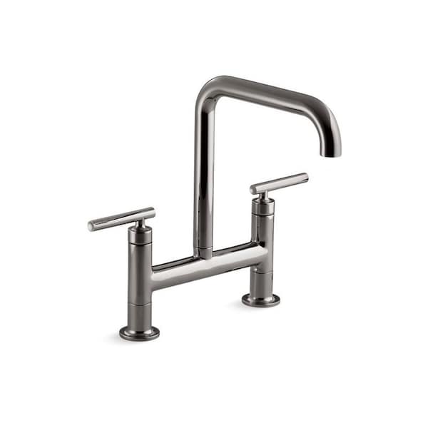 Pairing a classic bridge design with bold new touches, this Purist kitchen faucet combines distinctive modern style and easy-to-use features. The high-arch spout provides 10 inches of clearance and rotates 360 degrees, making way for your largest pots and pans. Extended lever handles offer plenty of grip area.