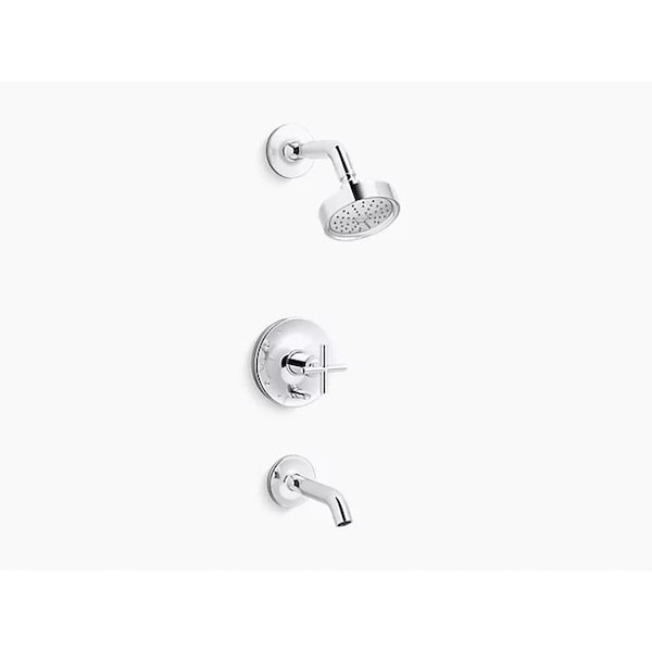 Purist faucets and accessories combine simple, architectural forms with sensual design lines. Featuring this modern, minimalist style, the Purist bath and shower valve trim creates a sophisticated, unified look in your shower with a cross handle, spout and water-saving showerhead. Pair this trim with a Rite-Temp pressure-balancing valve with push-button diverter, which maintains your desired water temperature during pressure fluctuations.