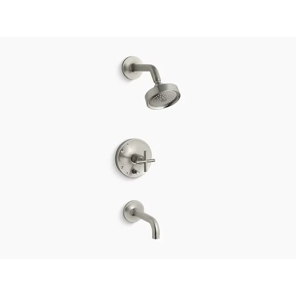 Purist faucets and accessories combine simple, architectural forms with sensual design lines. Featuring this modern, minimalist style, the Purist bath and shower faucet trim creates a sophisticated, unified look in your shower with a cross handle, spout, and showerhead. Pair this trim with a Rite-Temp pressure-balancing valve with push-button diverter, which maintains your desired water temperature during pressure fluctuations.