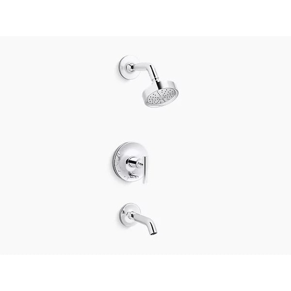 Purist faucets and accessories combine simple, architectural forms with sensual design lines. Featuring this modern, minimalist style, the Purist bath and shower valve trim creates a sophisticated, unified look in your shower with a lever handle, spout and water-saving showerhead. Pair this trim with a Rite-Temp pressure-balancing valve with push-button diverter, which maintains your desired water temperature during pressure fluctuations.