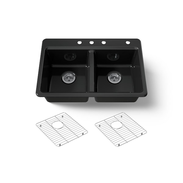 The understated beauty of this KOHLER Riverby sink makes it an elegant and versatile addition to the kitchen. The two equal-sized bowls feature a sloped base that minimizes water pooling. Crafted from enameled cast iron, this top-mount kitchen sink resists chipping, cracking, and burning for years of beauty and reliable performance. This Riverby sink includes two stainless steel sink racks.