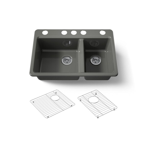 The understated beauty of this KOHLER Riverby sink makes it an elegant and versatile addition to the kitchen. The offset bowls allow you to keep clean and dirty dishes separate, while a sloped base minimizes water pooling. Crafted from enameled cast iron, this undermount kitchen sink resists chipping, cracking, and burning for years of beauty and reliable performance. This Riverby sink includes two stainless steel sink racks.