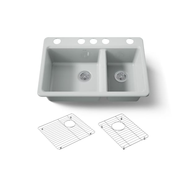 The understated beauty of this KOHLER Riverby sink makes it an elegant and versatile addition to the kitchen. The offset bowls allow you to keep clean and dirty dishes separate, while a sloped base minimizes water pooling. Crafted from enameled cast iron, this undermount kitchen sink resists chipping, cracking, and burning for years of beauty and reliable performance. This Riverby sink includes two stainless steel sink racks.