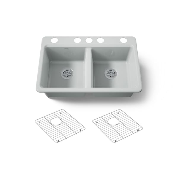 The understated beauty of this KOHLER Riverby sink makes it an elegant and versatile addition to the kitchen. The two equal-sized basins feature a sloped base that minimizes water pooling. Crafted from enameled cast iron, this undermount kitchen sink resists chipping, cracking, and burning for years of beauty and reliable performance. This Riverby sink includes two stainless steel sink racks.