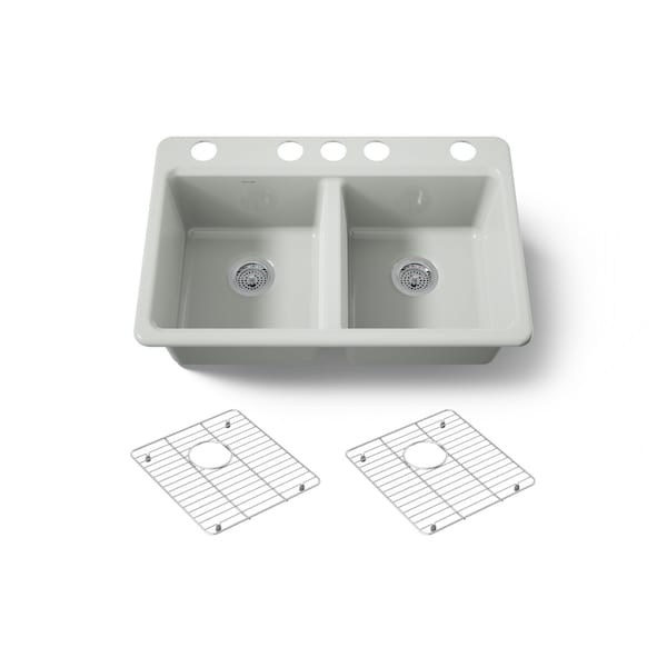 The understated beauty of this KOHLER Riverby sink makes it an elegant and versatile addition to the kitchen. The two equal-sized basins feature a sloped base that minimizes water pooling. Crafted from enameled cast iron, this undermount kitchen sink resists chipping, cracking, and burning for years of beauty and reliable performance. This Riverby sink includes two stainless steel sink racks.