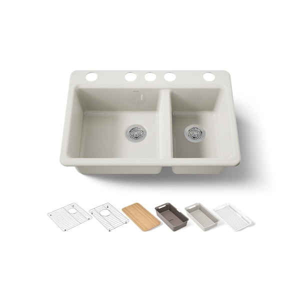 The understated beauty of this KOHLER Riverby undermount workstation kitchen sink makes it an elegant and versatile addition to the kitchen. Offset double bowls provide ample space to soak and wash cookware, while a sloped base to offset drains minimizes water pooling. Crafted from enameled cast iron, this sink resists chipping, cracking, and burning for years of beauty and reliable performance. This undermount kitchen sink comes with a wood cutting board, dishwasher-safe drain board, colander/drying rack, soaking bin, and one stainless steel sink rack.