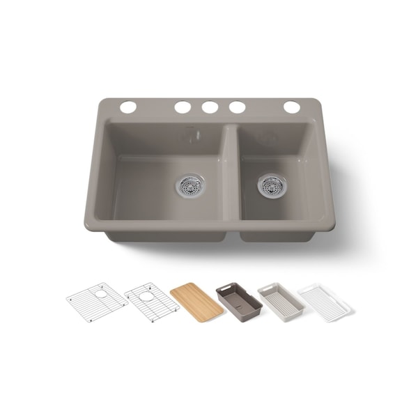 The understated beauty of this KOHLER Riverby undermount workstation kitchen sink makes it an elegant and versatile addition to the kitchen. Offset double bowls provide ample space to soak and wash cookware, while a sloped base to offset drains minimizes water pooling. Crafted from enameled cast iron, this sink resists chipping, cracking, and burning for years of beauty and reliable performance. This undermount kitchen sink comes with a wood cutting board, dishwasher-safe drain board, colander/drying rack, soaking bin, and one stainless steel sink rack.