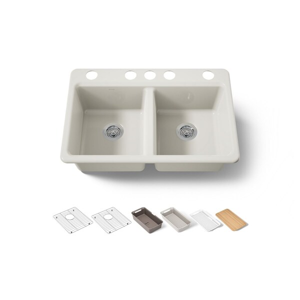 The understated beauty of this KOHLER Riverby undermount workstation kitchen sink makes it an elegant and versatile addition to the kitchen. Large double-equal bowls provide ample space to soak and wash cookware, while a sloped base to offset drains minimizes water pooling. Crafted from enameled cast iron, this sink resists chipping, cracking, and burning for years of beauty and reliable performance. This undermount kitchen sink comes with a wood cutting board, dishwasher-safe drain board, colander/drying rack, soaking bin, and two stainless steel sink racks.