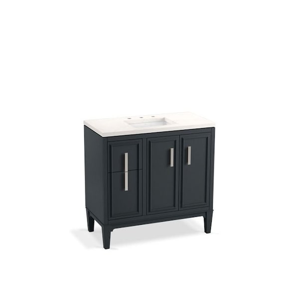 Elegant and mysterious, Southerk bathroom vanities evoke contemporary class with a nod to the traditional for an aesthetic that suits any style. Frame-like molding on drawer- and door-front panels tease hidden storage entrances, further adorned with elongated decorative handles that align to form a single design element on stacked drawers. Make your everyday vanity uniquely yours with choice of color. Cabinet, countertop, sink, legs, and Vibrant Brushed Nickel hardware are included with the vanity set, which is ready to self-install during your next bathroom update. Additional hardware finishes are also available.
