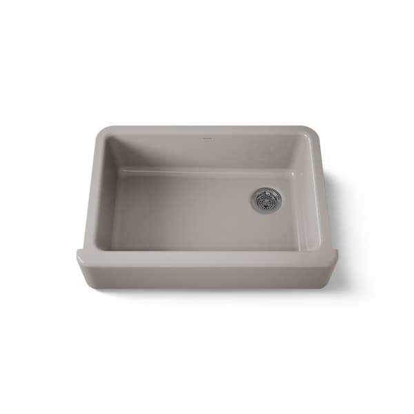 The KOHLER Whitehaven apron-front kitchen sink features a streamlined and versatile farmhouse style to complement any decor. A large single basin accommodates large pots and pans, while the sloped bottom helps with draining and cleanup. Crafted from enameled cast iron, this sink resists chipping, cracking, or burning for years of beauty and reliable performance. A standard apron front makes it easy to install on 33-inch apron-front cabinetry. The Self-Trimming design requires only a simple rough cut, overlapping the cabinet face for beautiful results.