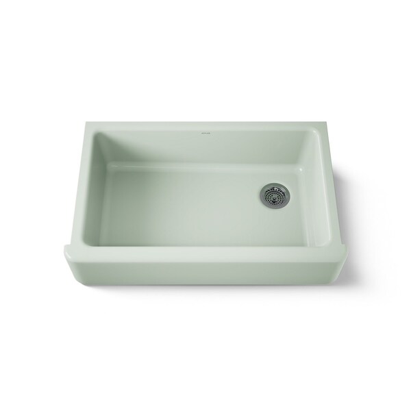 The KOHLER Whitehaven apron-front kitchen sink features a streamlined and versatile farmhouse style to complement any decor. A large single basin accommodates large pots and pans, while the sloped bottom helps with draining and cleanup. Crafted from enameled cast iron, this sink resists chipping, cracking, or burning for years of beauty and reliable performance. A standard apron front makes it easy to install on 36-inch apron-front cabinetry. The Self-Trimming design requires only a simple rough cut, overlapping the cabinet face for beautiful results.