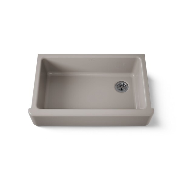 The KOHLER Whitehaven apron-front kitchen sink features a streamlined and versatile farmhouse style to complement any decor. A large single basin accommodates large pots and pans, while the sloped bottom helps with draining and cleanup. Crafted from enameled cast iron, this sink resists chipping, cracking, or burning for years of beauty and reliable performance. A standard apron front makes it easy to install on 36-inch apron-front cabinetry. The Self-Trimming design requires only a simple rough cut, overlapping the cabinet face for beautiful results.