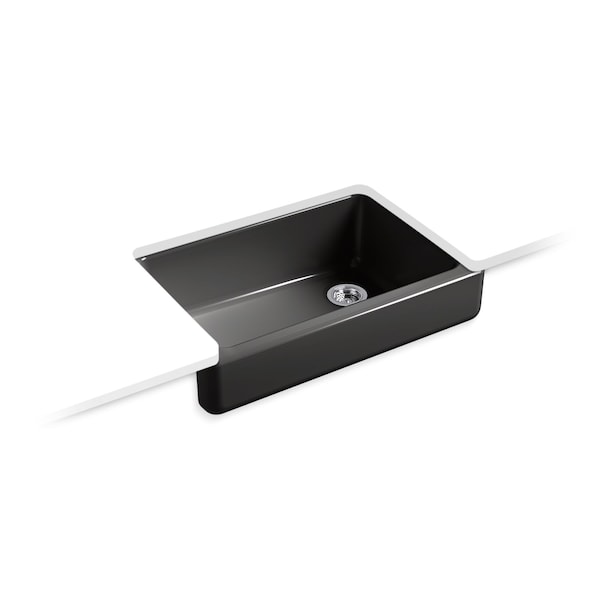 The Whitehaven apron-front kitchen sink features a streamlined and versatile farmhouse style to complement any decor. Perfect for remodeling projects, it has a shortened apron that allows for installation on most new or existing 33-inch standard cabinetry. The Self-Trimming design requires only a simple rough cut, overlapping the cabinet face for beautiful results and easy installation. A large single basin accommodates large pots and pans, while the sloped bottom helps with draining and cleanup. Crafted from enameled cast iron, this sink resists chipping, cracking, or burning for years of beauty and reliable performance.